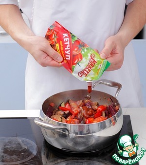 Добавить помидоры и кетчуп, перемешать, поперчить и посолить по вкусу. Готовить без крышки 10 мин.