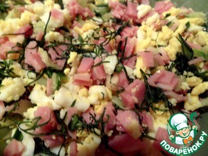 Нарезаем мелкими кубиками ветчину, яйцо, огурец, мелко режем укроп, чеснок, посыпаем солью, перцем и молотыми орехами.