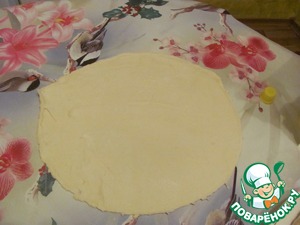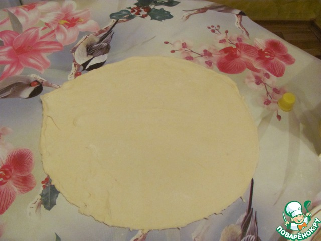 Раскатываем слоеное тесто (тесто покупала в магазине) и вырезаем нужного нам диаметра коржи. Всего нам понадобится 4 коржа.