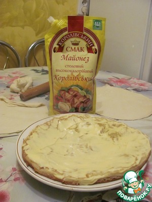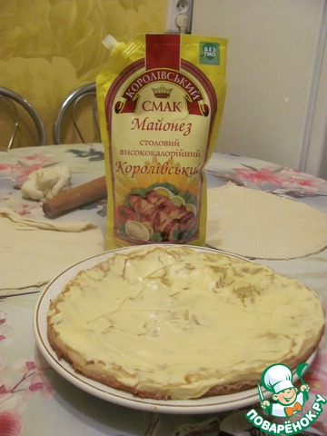 Каждый корж смазываем майонезом. Обязательно должен быть жирный майонез, не менее 67%.