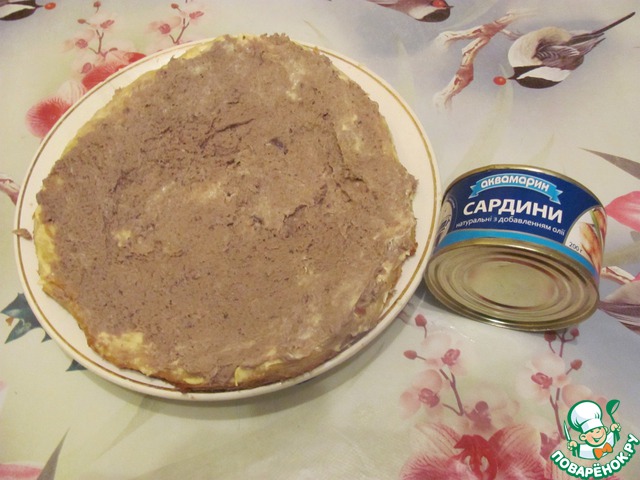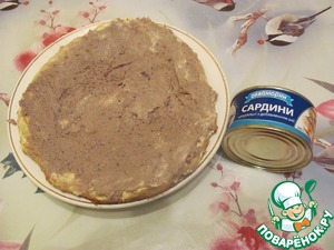 Второй корж: измельчаем в блендере консервы, у меня "Сардины в масле", предварительно слив масло, получается однородная масса.