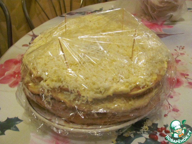 После чего ставим наш "пирог" на ночь в холодное место. Для того чтобы не нарушить целостность верхнего слоя, я поставила зубочистки 4 шт и потом обвернула его пищевой пленкой.