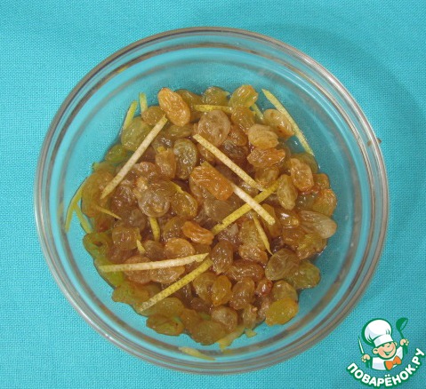 Изюм обдать кипятком, просушить, добавить цедру и коньяк. Оставить для настаивания на 2 часа или более.
