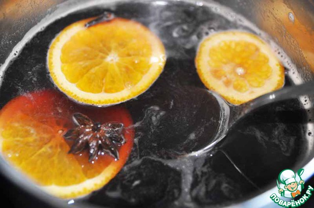 Добавляем к напитку апельсины, нагреваем, но не кипятим, до 70-80 градусов. Можно использовать термометр.