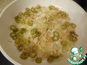 Добавить оливки, кедровые орешки и чеснок. Жарить в течение 3-5 минут