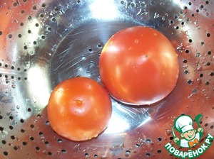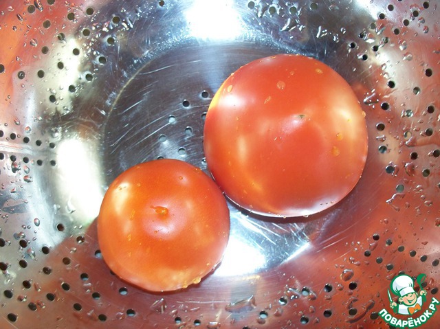 Помидоры обдаем кипятком, снимаем кожицу, нарезаем.