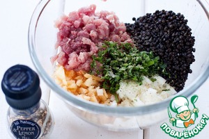 Смешать мясной фарш, отварную чечевицу, лук, айву и мелконарезанную зелень. Добавить соль и специи. Я добавляла лимонный перец и немного кориандра