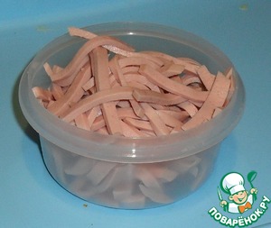 Колбасу нарезать соломкой или натереть на крупной терке или измельчите любым способом.