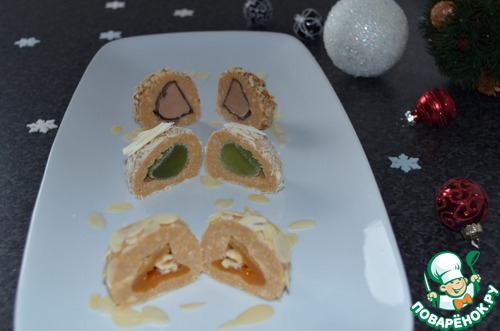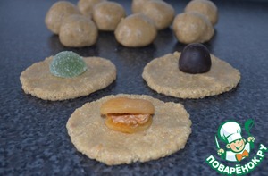 Руками из одной части сформируйте лепёшечку и в середину положите одну мармеладинку. Из лепёшечки скатайте шарик так, чтобы мармеладенка была в середине. Можно взять конфетку или урюк, замоченный в воде, во внутрь положить кусочек орешка!