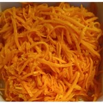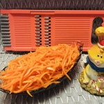 Морковь натираем на терке для корейской моркови. Я стараюсь брать длинную морковь, проще натирать. Да и красивее получается.
