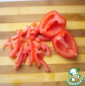 Из помидор убираем семечки и сок. Нарезаем адекватно курице и перцу. Помидорные кусочки должны быть сухими.