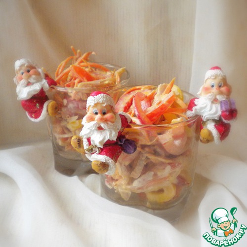 Рецепт этого салата вычитала лет несколько назад в каком-то журнале, уж и не вспомню. Он у нас обосновался, прижился. Возможно, изменил пропорции, и, уж точно, название.