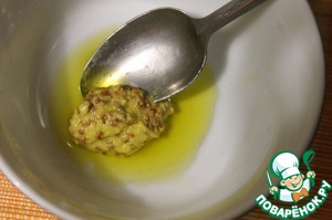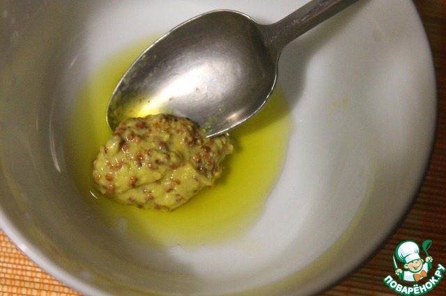 Для соуса смешать оливковое масло, зерненую горчицу и лимонный сироп