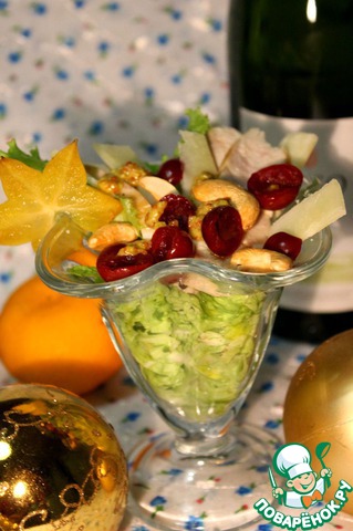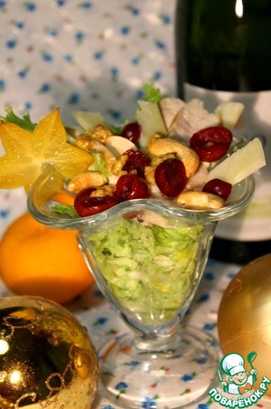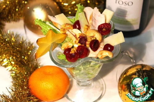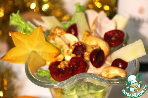На салат выложить ломтики куриной грудки, пластики сыра, половинки черешни, орешки кешью, все полить соусом и украсить долькой карамболы