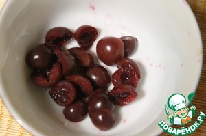 Вишню или черешню (у меня замороженая вишня) разрезать пополам и освободить от косточки