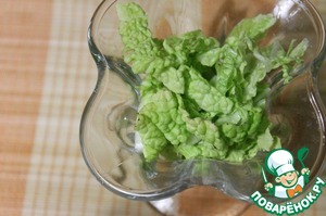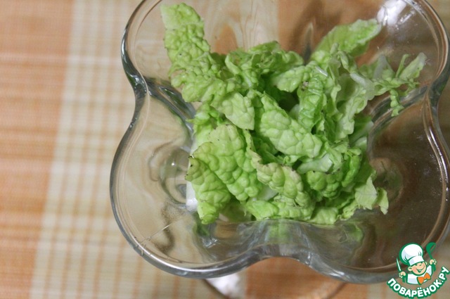 Пекинский салат и листовой салат нарезать тонкими полосками и уложить на дно креманки