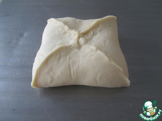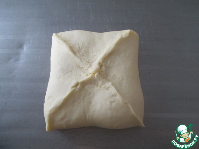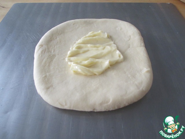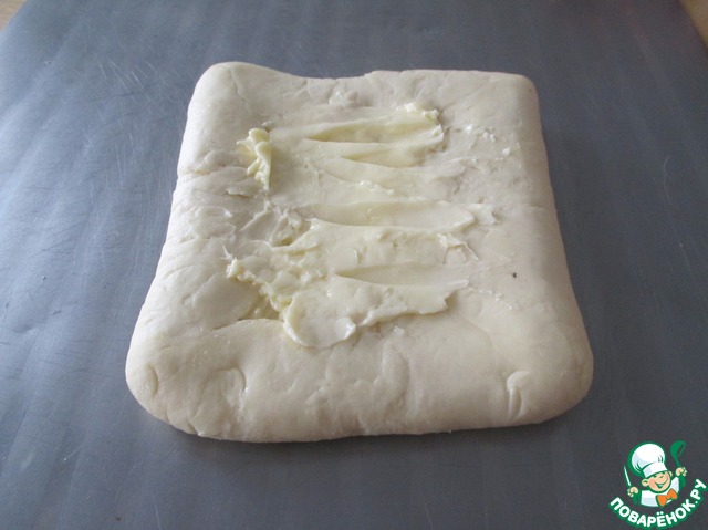 Сливочное масло комнатной температуры (100 гр) разделить на 4 части. Тесто раскатать в НЕ тонкий квадрат. Середину смазать 1/4 масла.