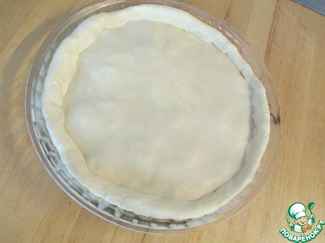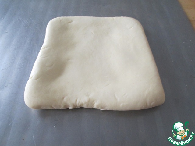 Этот пирог выпекается со слоеным бездрожжевым тестом, которое можно купить или сделать, как я, в домашних условиях. Рецепт теста с нашего сайта http://www.povarenok .ru/recipes/show/759 40/ от MarinaKhokhlova, пользуюсь им часто, никогда меня не подводил. Итак, из муки (250 гр), воды (100 мл), лимонного сока (1 ст. л), половины яйца и щепотки соли замесить эластичное тесто. Оставить его под салфеткой на 20 минут.