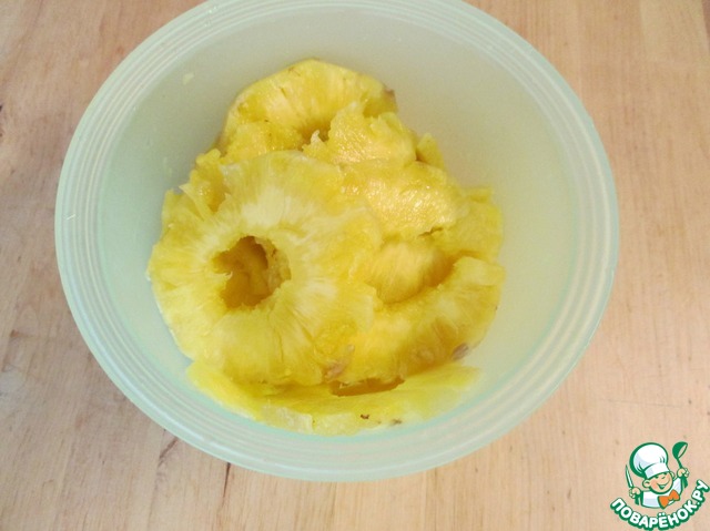 Свежий ананас (плод лучше выбирать спелый и небольшого размера) очистить от кожуры и твердой сердцевины, нарезать кольцами толщиной примерно 3 мм и смешать с соком 1 лимона.