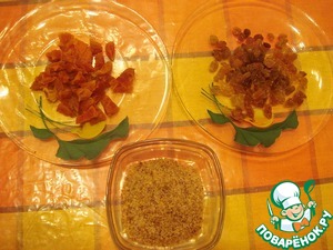 Приготовить курагу, изюм и орехи. Курагу, если жестковата, можно проварить 2 минуты в небольшом количестве воды. Если время есть, можно и замочить на полчаса.