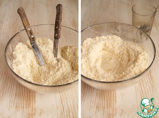 В центре масляно-мучной крошки сделать углубление и влить туда 5 ст. л. холодной воды.