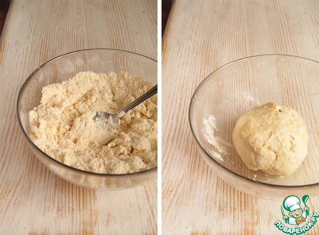 Замесить тесто руками. Месить быстро, основанием ладони, минимальное количество времени, чтобы не начало прилипать к поверхности. Собрать в комок.