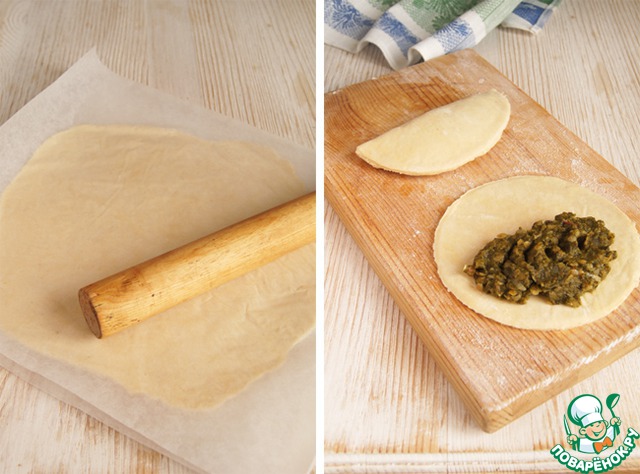 Достать охлаждённое тесто, чуть припылить поверхность мукой и вырезать 6 кругов диаметром примерно 15 см, я воспользовалась чайным блюдцем в качестве шаблона. Края каждой заготовки смочить водой, выложить на одну половину начинку, сложить круг пополам в полукруг.