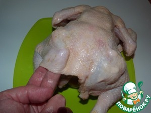 Курицу (курица должна быть весом примерно от 1 кг до 1,5 кг) надо помыть и обсушить бумажными полотенцами. Срезать жир в области шеи и попки.