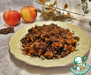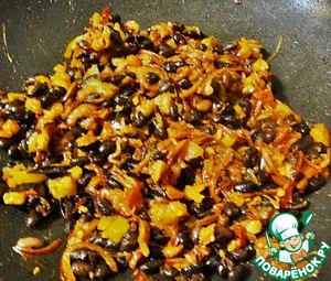 Положить в обжаренные овощи баклажаны и отварную фасоль. Перемешать, посолить, положить пряности. Кладите по чуть-чуть и пробуйте, а то можно легко испортить всё блюдо.