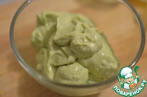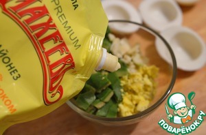Вареные яйца почистить, разрезать на половинки и аккуратно вынуть желтки. Приготовим зеленый мусс из авокадо. Готовим непосредственно перед подачей, не заранее!! Авокадо почистить и нарезать мякоть, сбрызнуть лимонным соком, чтобы не потемнела. Добавить желтки, чеснок по вкусу (можно и без него) и майонез с лимонным соком от Махеевъ, он как раз очень подойдет для этой начинки, придаст ей пикантности. Всё хорошо взбить блендером до состояния мусса. Я не солила, так как майонез уже соленый.