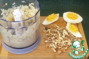 Измельчаем ингредиенты до желаемых размеров. Как видно на фото, у меня не очень мелкий помол. Чаще я даже к блендеру не прибегаю. Сельдерей и яйцо вилкой размяла, слегка орехи ножом порубила и - готово. По идее, можно все до пюре растереть. И в дальнейшем использовать как намазку на хлеб.