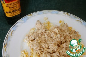 В получившийся фарш добавляем растительное масло, соль, немного уксуса или сока лимона, перец. Хотите - чеснок. Собственно, любые специи, которые вам нравятся. Сама по себе масса из сельдерея, яйца и ореха не имеет ярко выраженного вкуса, лишь оттенки. Я обычно ограничиваюсь солью, уксусом/лимоном, отводя роль "акцента" - посыпке.