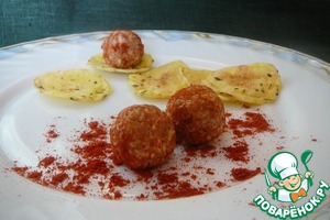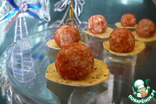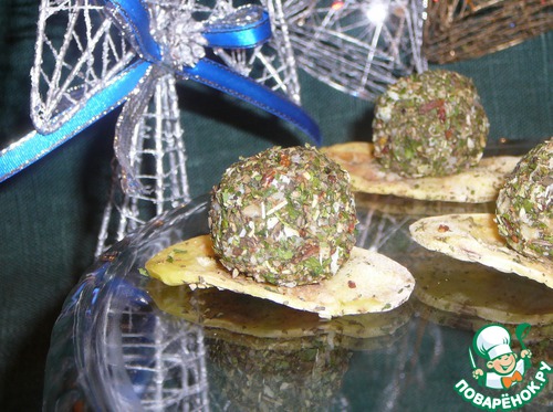 Шарики обваливаем в паприке или в травах, кунжуте, желтках и т. д. И выкладываем на чипсы. У меня чипсы домашнего приготовления, с успехом сушу их в микроволновке на шпажках. Вот ссылка на мои художества http://www.povarenok .ru/recipes/show/761 34/ (пробел убираем)
