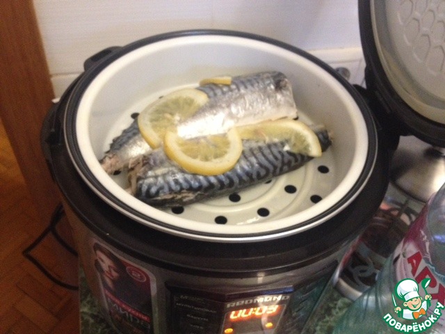 Выложить все в мультиварку на решетку для пара, воды наливаем примерно по отметку 4, если одна закладка рыбы, и по 6, если две закладки