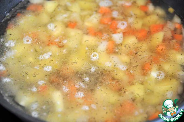 Добавляем бульон (овощной или мясной), доводим до кипения и варим 5 минут. -