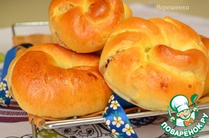 Для смазки желток взбить с молоком. Смазать булочки кисточкой. Выпекать в заранее разогретой до 180 градусов духовке около 20 минут, до золотистого цвета.
