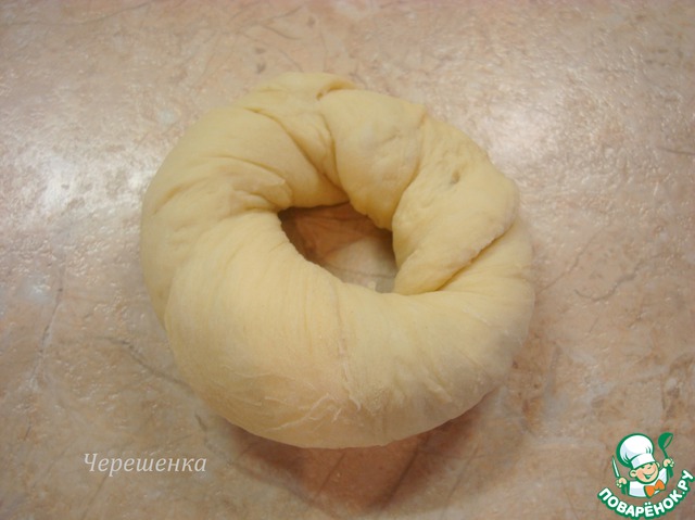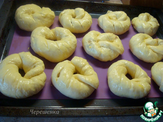 Противень смазать растительным маслом, присыпать мукой. Если у вас есть силиконовый коврик, то воспользуйтесь им. Его не нужно смазывать. Сверху выложить наши колечки. Затем взять острейший нож и сделать сверху надрезы наискосок. Накрыть пленкой и сверху полотенчиком. Дать постоять минут 30, чтобы в объеме булочки увеличились в 2 раза.