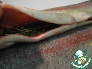 Рыбу сбрызнуть апельсиновым соком, в брюхо каждой рыбы положить по розмариновой веточке.