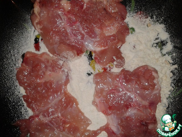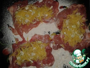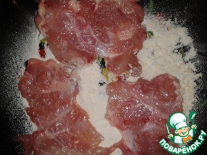 Выложить начинку на мясо, которое затем свернуть рулетом, обвалять в муке и яйце.