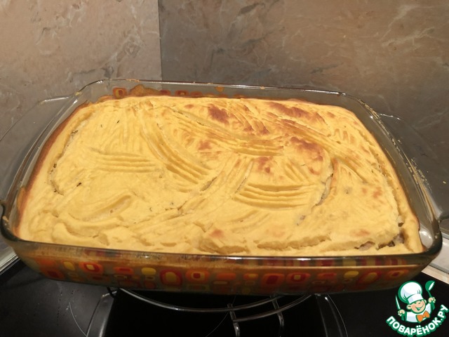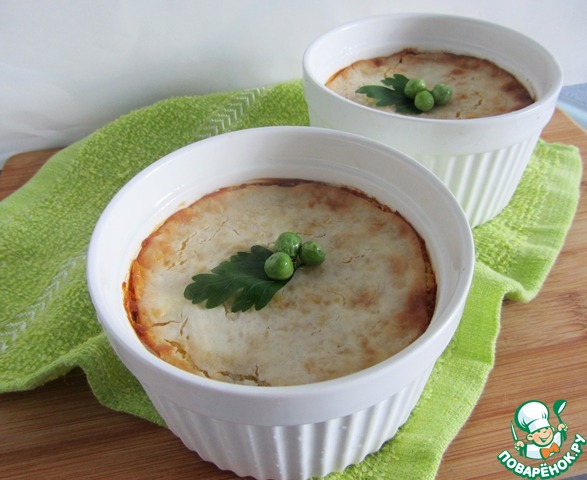 Сверху опять гороховое пюре. Верх смазываем сливками. Затем ставим в духовку на 30 минут.