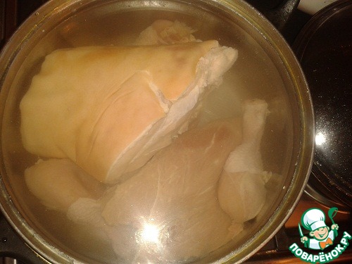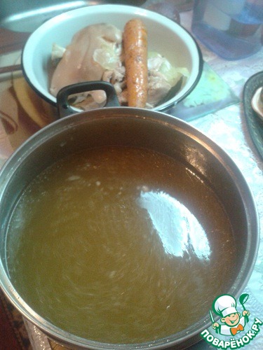 Мясо промываем в холодной воде. Еще лучше на ночь замачиваем. Наливаем в кастрюлю воду. Кладем: лопатку, голяшку. Доводим до кипения на среднем огне. Не забываем снимать пенку при ее образовании. Как только мы довели до кипения, делаем огонь на минимум. Накрываем крышкой и варим 3 часа.