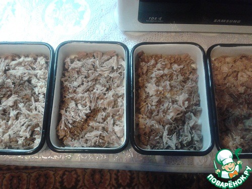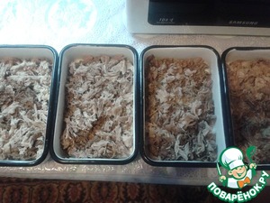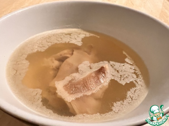 Остывший бульон процеживаем через ситечко. Заливаем в лоточки. Холодец остужаем до комнатной температуры и отправляем в холодильник на ночь.