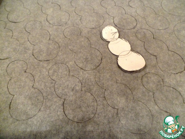 • На противень выстилаем бумагу для выпечки, вырезаем трафарет снеговика и рисуем на кальке снеговиков.