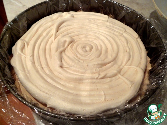 • Выстилаем разъемную форму пищевой пленкой и кладем первый корж.