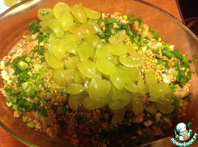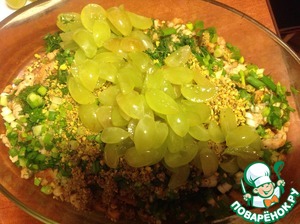 Виноград разрезать на четыре части (можно взять два вида винограда - красный и зеленый)