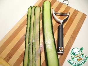 Огурец мою и нарезаю на тонкие ломтики с помощью ножа для чистки овощей.
