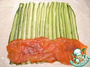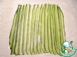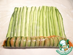 Я брала длинный огурец, поэтому получившихся ломтиков хватило на два рулета, каждый из которых я разрезала на 8 частей.