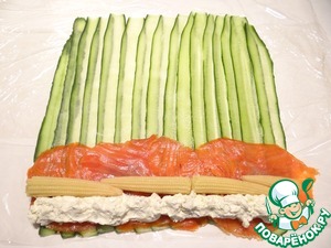 Сворачиваю с помощью пленки рулет до середины огуречного слоя.