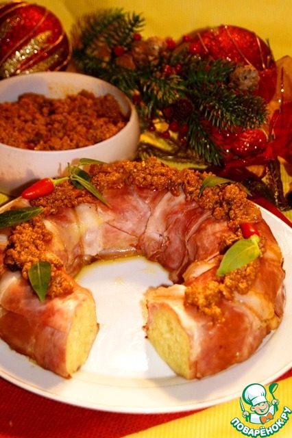 Выстелите форму ветчиной так, чтобы за ее бортики свисали края.