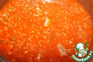 Добавить томатную пасту и 300 мл овощного бульона, перемешать, довести до кипения. Убрать огонь до минимума и тушить 2 часа. Если бульон выкипел до истечения положенного времени, то добавьте его еще, но учтите, что в конце варки он должен выкипеть почти полностью.